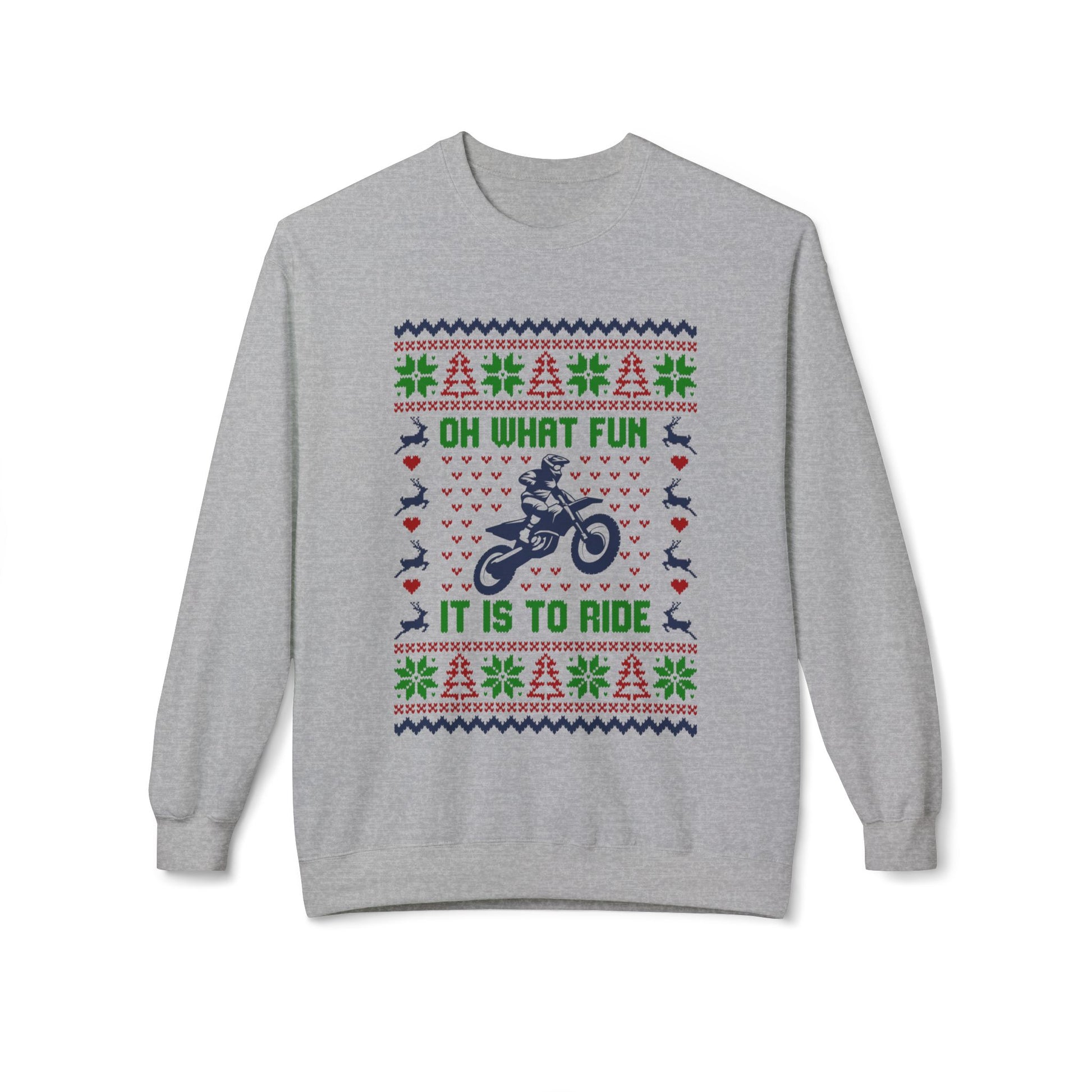 This midweight crewneck sweatshirt brings cozy warmth and playful holiday spirit to riders who love two wheels and winter nights. The knit-like graphic reads like an ugly-Christmas-sweater riff: pixelated snowflakes, evergreen rows, and a central silhouette of a motorcycle with the cheeky line “Oh what fun it is to ride.” The garment’s heavier 8.4 oz fabric and classic fit hold shape through long rides to gatherings or relaxed evenings by a bonfire. Dropped shoulders and ribbed cuffs give it a relaxed, lived-in feel while the tubular knit means a clean, seam-free body that sits smoothly under a jacket or on its own.